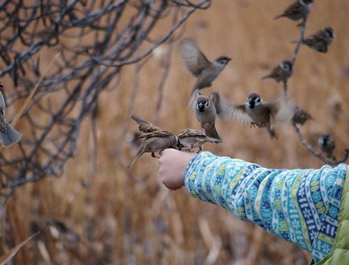 雀が餌をめがけて(不忍池で)