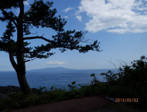 磯の彼方に大島がくっきりと