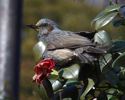 椿に止まったヒヨドリ(浄妙寺)